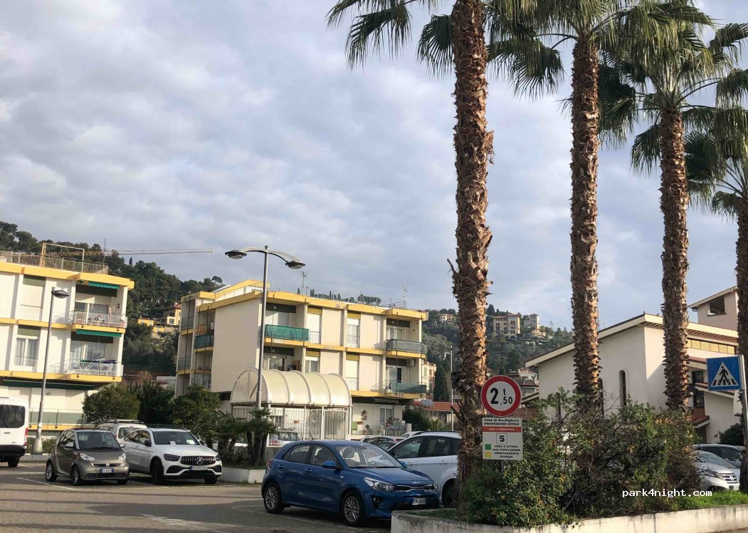 Free parking up to 2.5t, dog area across the road, 1 km from the center of Bordighera. Quiet in a residential area, the road ends a few meters ahead. There is no shade.