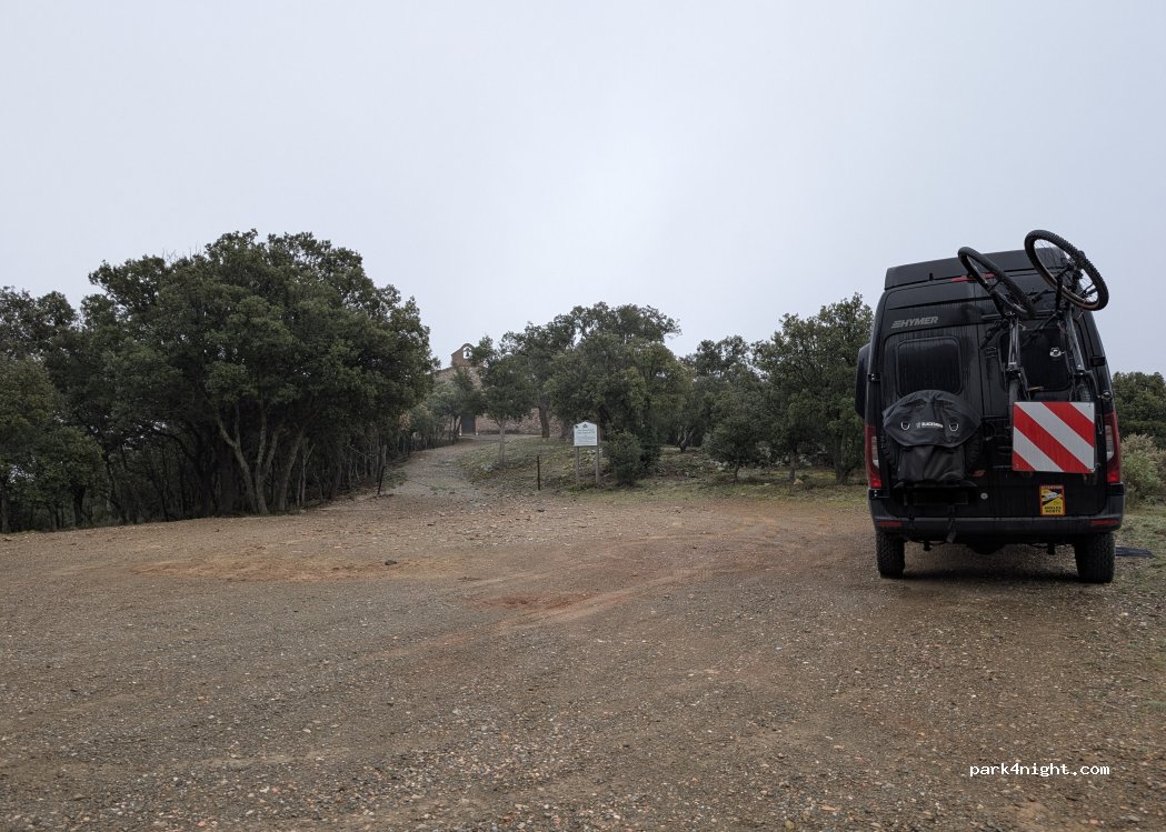 Hermitage car park. 1 to 2 motorhomes. watch out for fire, summer. In full garrigue. Nice view of Oms and its hills. Small road to get there. Very calm.