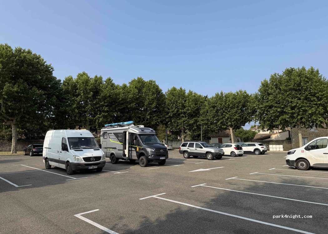 Parking un peu ombragé la journée et éclairé la nuit. Très calme. A deux pas à pieds des commerces. Super pratique et très agréable. Des toilettes publiques mais nous ne les avons pas utilisés.