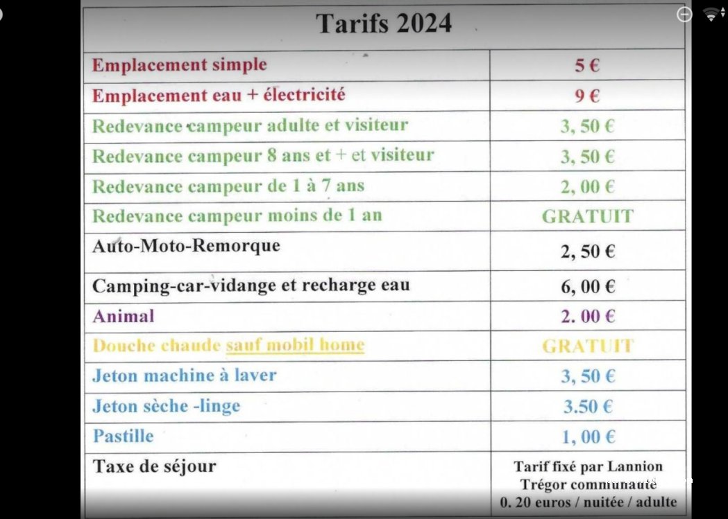 Conforme à la description, à signaler la propreté exemplaire des sanitaires ; Wi-Fi gratuit et, pour une fois, pas limité aux proches abords du bureau du camping. Au 30/07, le forfait camping-car pour une nuit est à 10€, rajouter 0,30€ par personne et par jour pour la taxe de séjour, et 4,50€ pour l'électricité, soit 15,10€ par nuit pour deux personnes, ce qui est vraiment très correct à quelques kilomètres de la partie la plus touristique des Cotes d'Armor. Hélas, ce descriptif quasi-parfait est quelque peu terni par la présence de nombreuses "familles Groseille" friandes de ce genre d'endroit bon marché, familles dont la propension à brailler, jacasser, éructer, etc, finit par lasser quelque peu. Dommage.