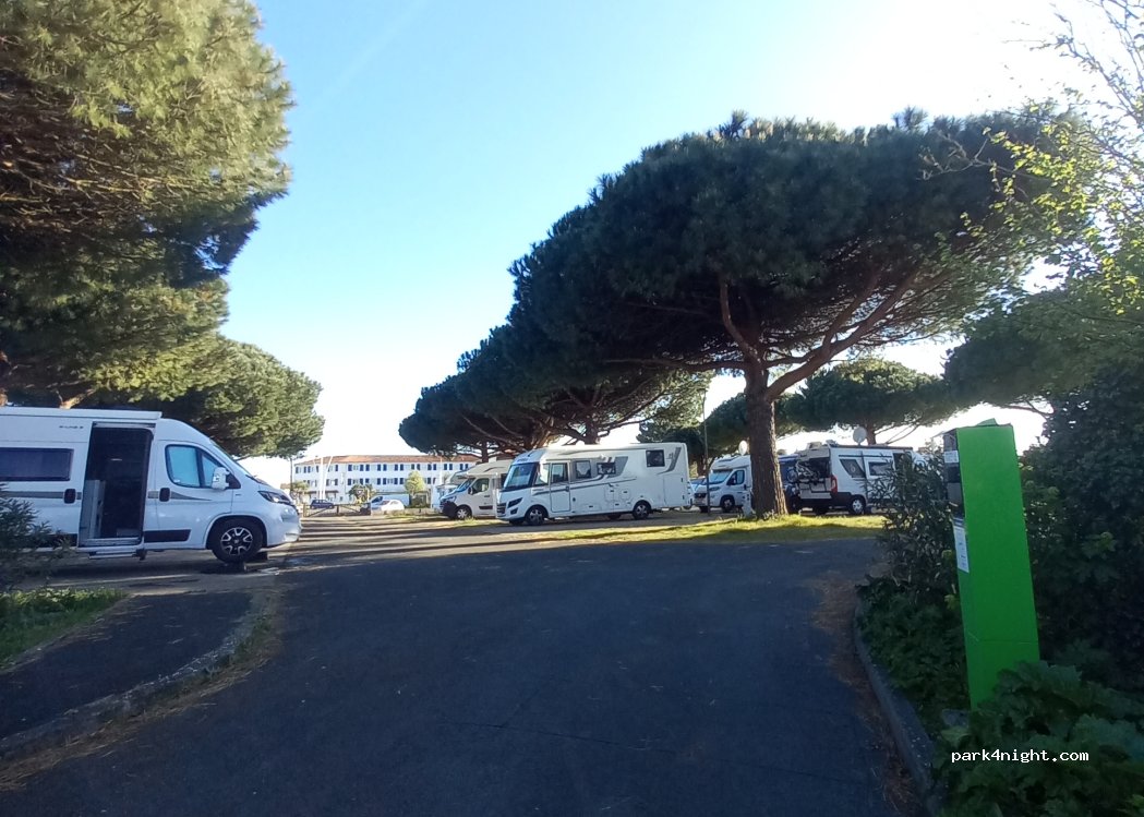 Très bien situé, à qqls mètres de la rue avec commerces, glaciers, bars, restaurants, la plage est au bout. Un peu serré entre camping-car mais ce n'est pas non plus aussi serré qu'un parking, ca reste assez raisonnable. Ombragé, entrée d'un côté avec eau, vidange eaux noires et sortie à l'opposé de l'aire. Pour une mi-juin, nuit calme, et bruits des rues peux perceptibles de jour comme de nuit.