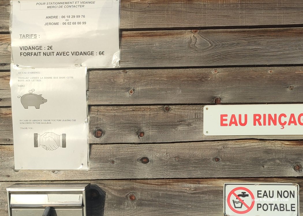 Arrêt pour la nuit à 21h, le propriétaire qui était sur les lieux a notre arrivée est venu à 22h30 pour encaisser… 8€ et non pas 6€ annoncé sur l’appli…