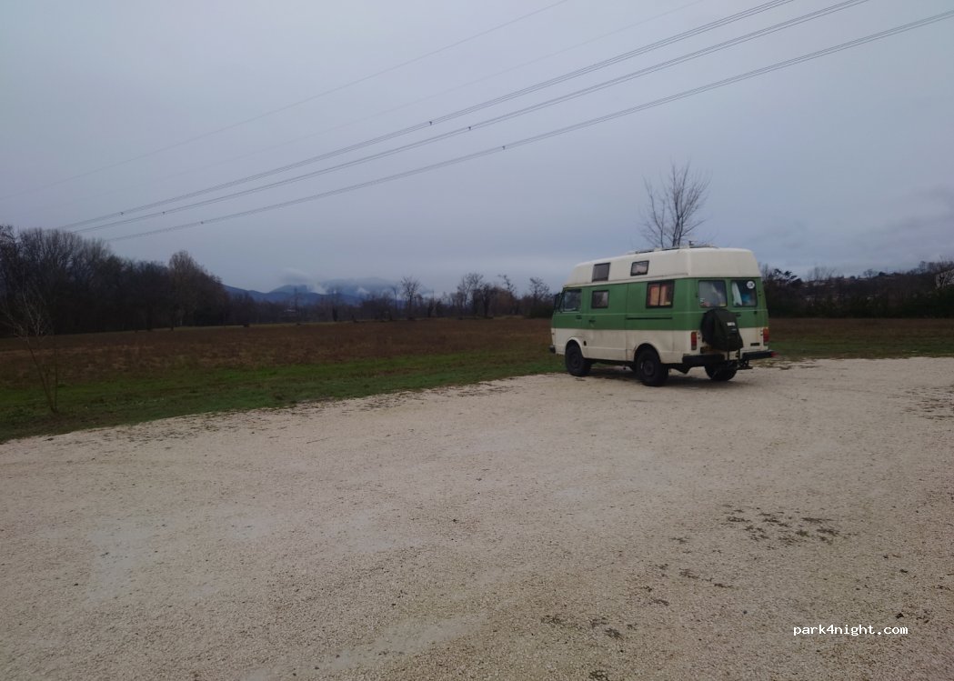 Gravel car park on the side of the road, it is noisy but leads to the nature park and you can see some mountains. No prohibition signs. Seasonal cafe also.