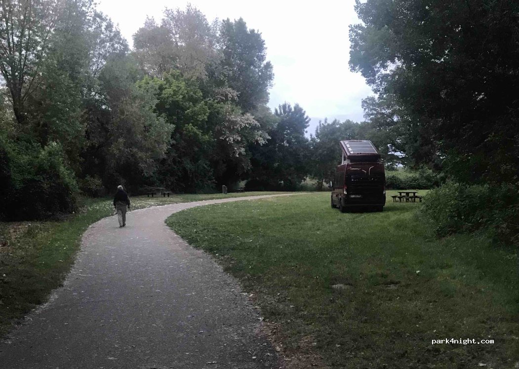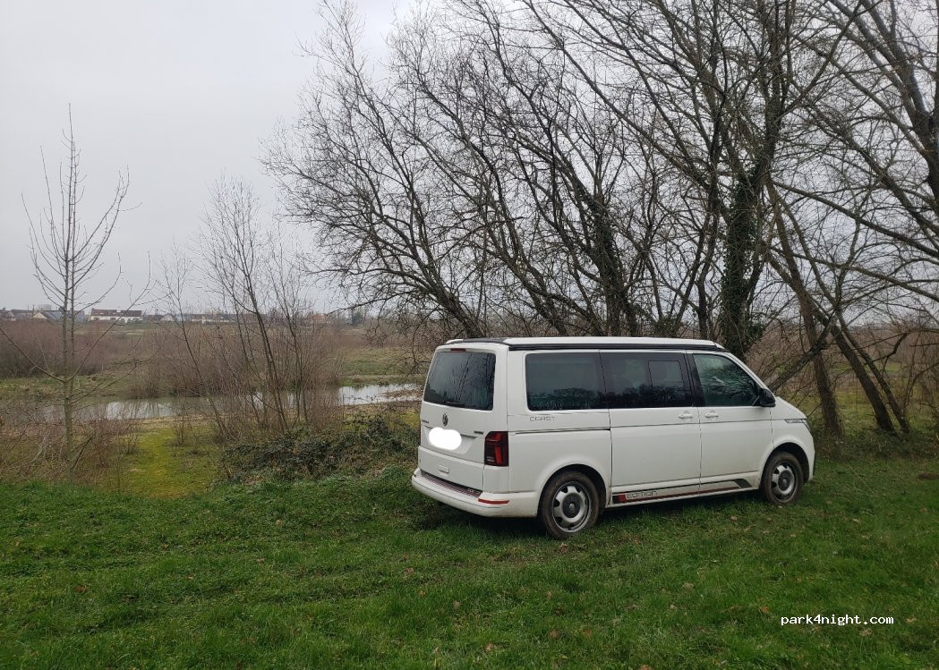 Endroit extrêmement calme pour la nuit car cul de sac. Seuls randonneurs et cyclistes passent par ici. Pas d’accès direct à l’eau mais on peut voir passer les montgolfières. Passez l’air de stationnement et continuez le chemin jusqu’au bout. Tables et poubelles. Très propre.