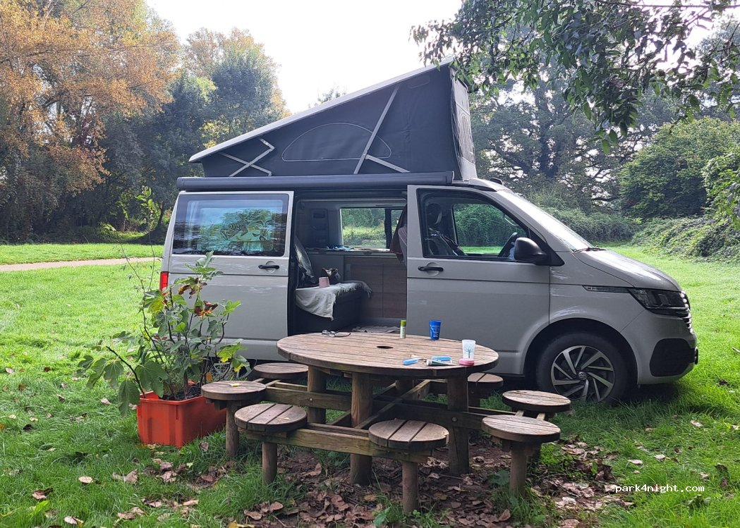 coin avec petit parking en gravier. loin coin en herbe. chemin accessible. calme. sommes arrivés de nuit et sous la pluie, pas vue le décors.demi tour facile.