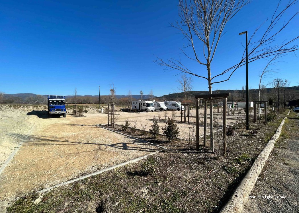 Aire au bord de l'eau à Apt (84). Aire sans caractère particulier. Son principal atout est son positionnement près d'une base de loisirs et parcours sportif. Emplacements pas très larges, délimités, sur sol stabilisé. Plutôt calme jours et nuits.
