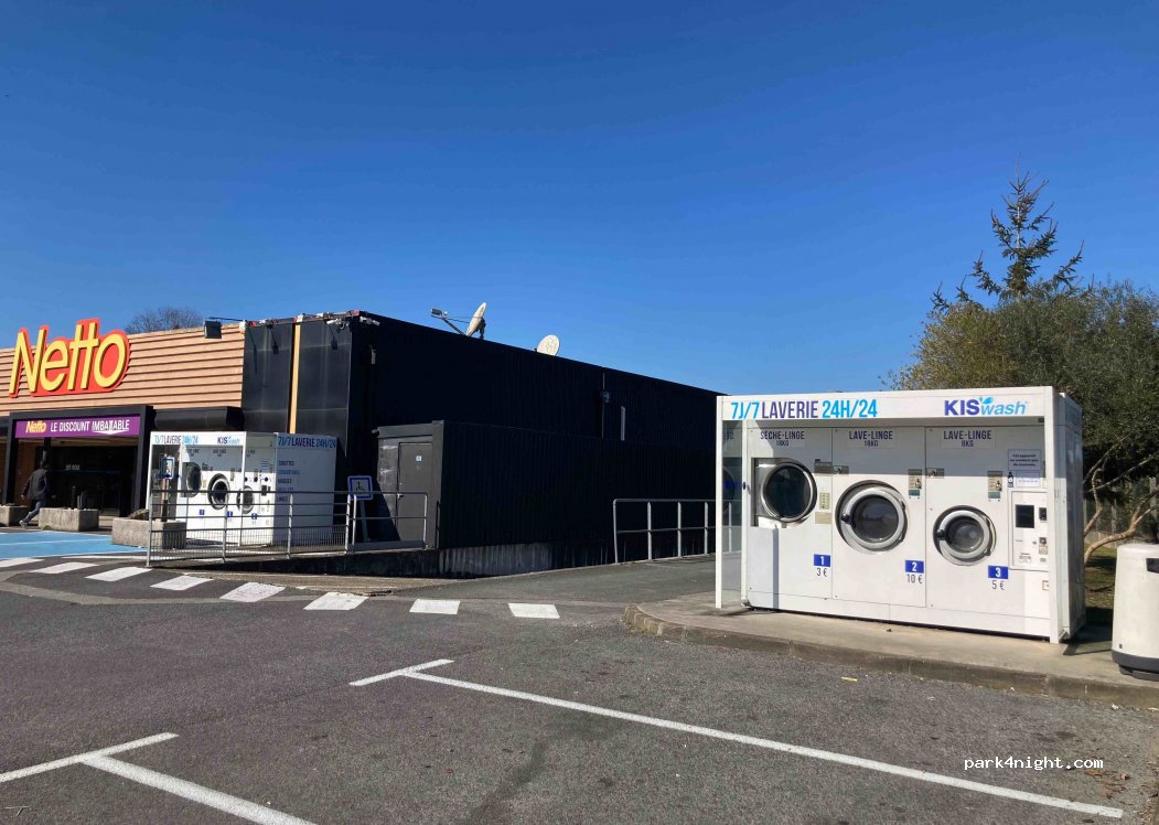 2 Laveries disponibles 24h/24 et 7j/7 chez Netto. Chacun a un baril de 8kg et 18kg. Un séchoir de 18 kg. Détergent inclus et assouplissant disponible. Peut être payé par carte de crédit ou en espèces, mais pas de monnaie.