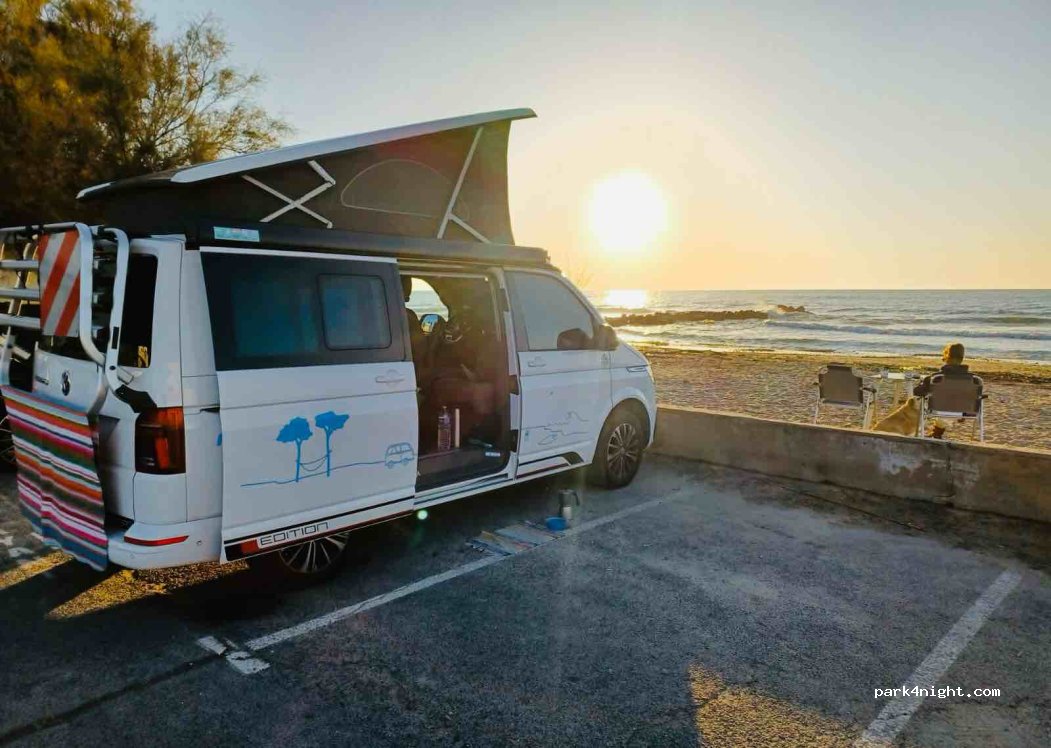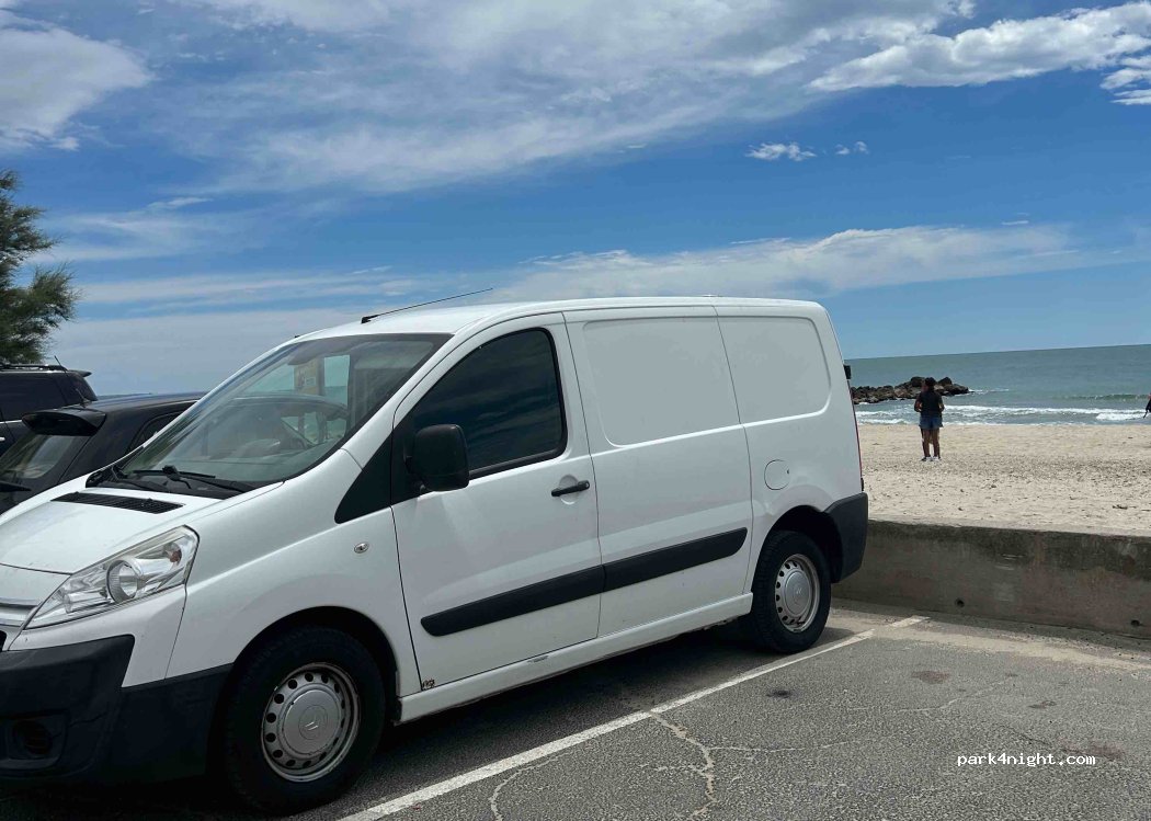 Parking au ras de la plage. Barrière à 2m. Nombreuses places dispo à notre arrivée. Environ une vingtaine au total