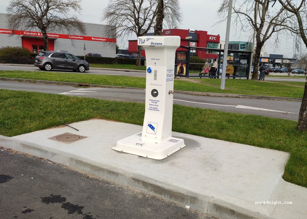 Près de la station service carrefour, eau et électricité 20 minutes gratuites, vidange eaux noires et eaux grises, en plein milieu de la zone commerciale, tout neuf, tout propre.