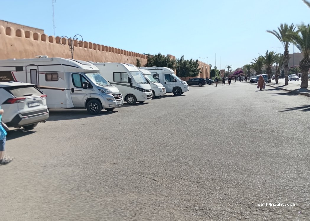 Good off street parking set back from the main road and guarded. Right by the walled madina. I paid the guard a small amount after staying 3 hours. Lots of nice shops and nice walk around the walled madina. there is plenty of these little set back car parking areas along this road with many mohos but need to get here early to find space.