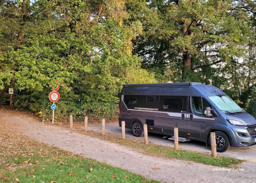 Stationnement sur le parking du bois, du parcours disc-golf et d'une salle communale. Les toilettes et le point d'eau sont situés en direction de l'aire de jeux.