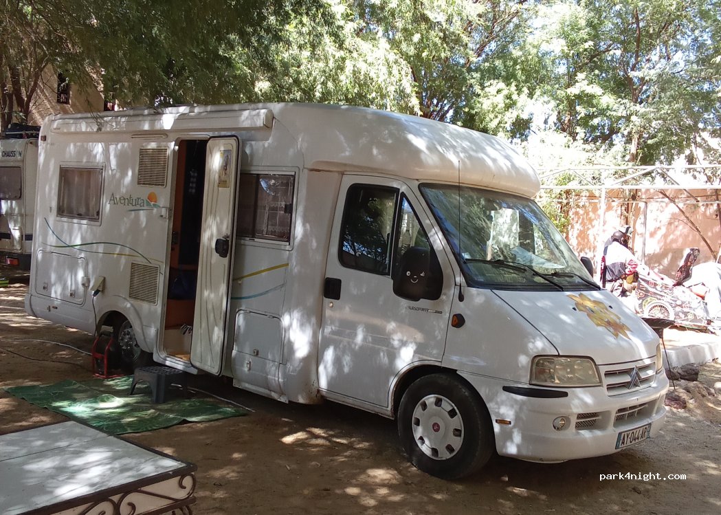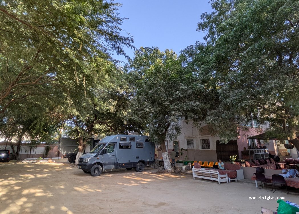 It's a "parking" for a hostel for 4-6 cars/vans. The price is between 250-300 Ouguiya. The owner is very friendly. The toilets and showers are okay. They also sell food and it's good. There are shops around to get necessary things. The Wifi is very fast!