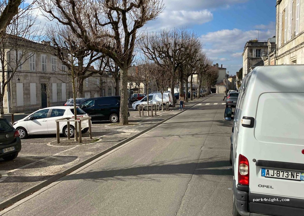 Large parking. Narrow spots with lots of trees, not for large cars ! But there is also parking on the parallel street.