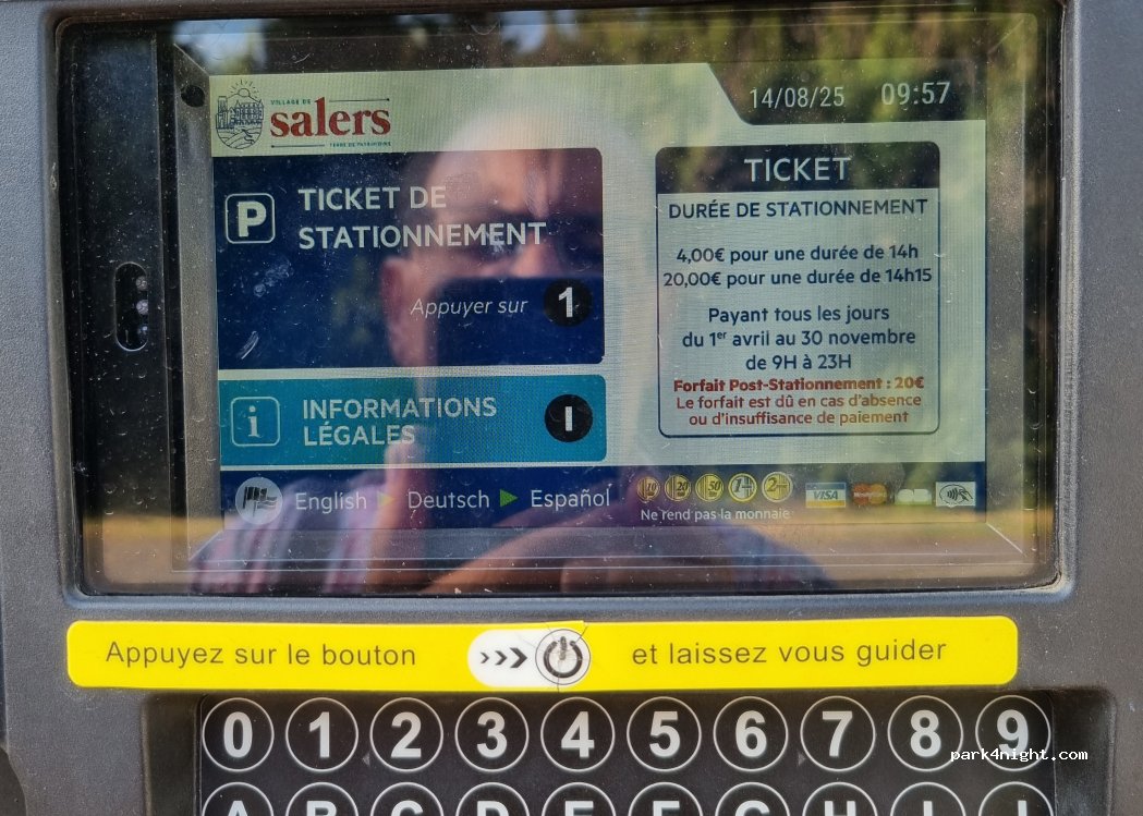 Parking payant 3€ de 9h à 23h. Le paiement est valable pour 14h de stationnement payant. Emplacement au bord d'une route avec du passage. Tous les campings car sont alignés les uns après les autres. Concernant les restaurants dans Salers le soir il fait réserver car il était tous complet lors de notre visite en septembre