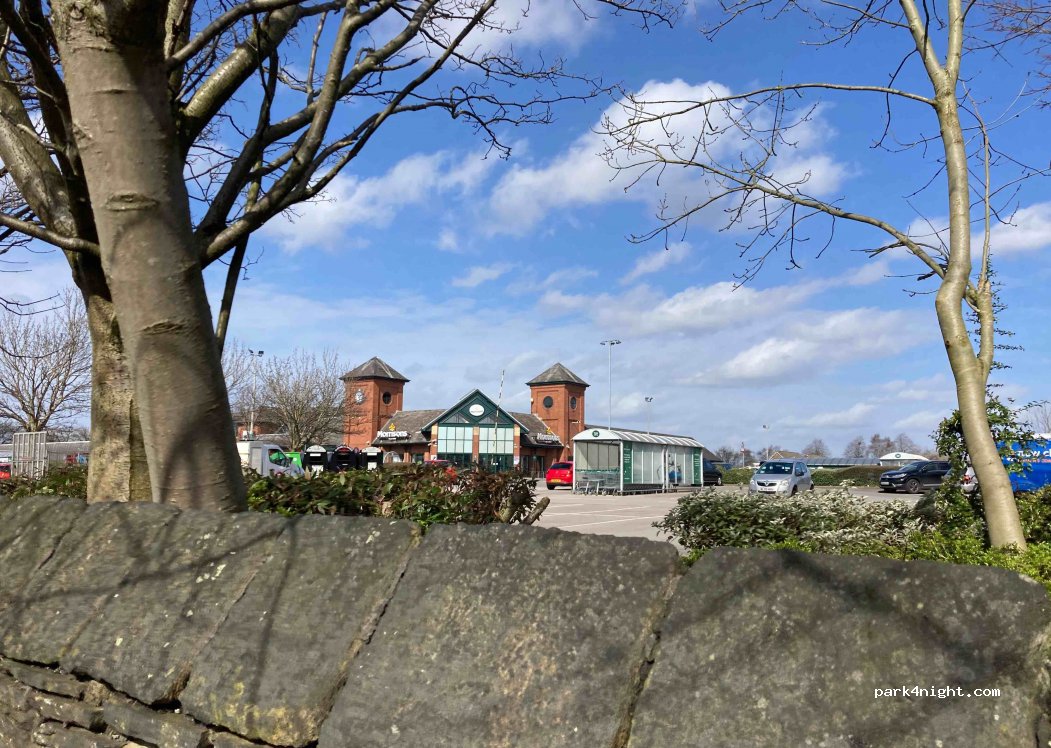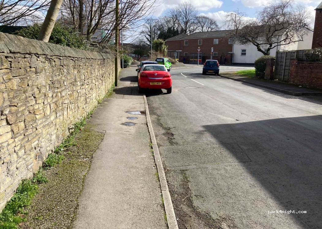 Small street with houses one side of street and a wall on the other, over the wall is a big Morrisons.