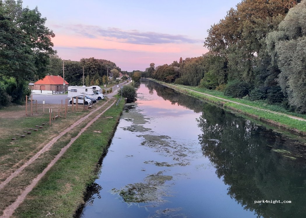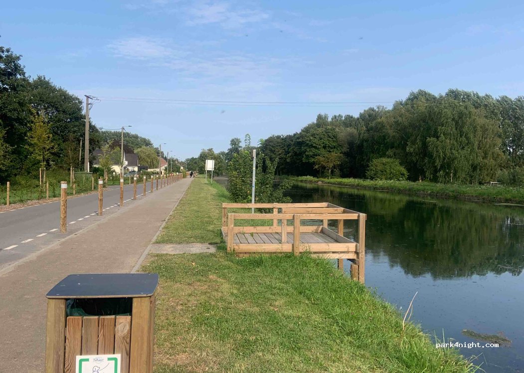 Endroit réaménagé. Parking pour la friterie avec 6 places voitures. Rempli pendant l'heure du midi. Pas de places pour se poser ni envisager de passer une nuit. Très fréquenté par les promeneurs le long du canal.