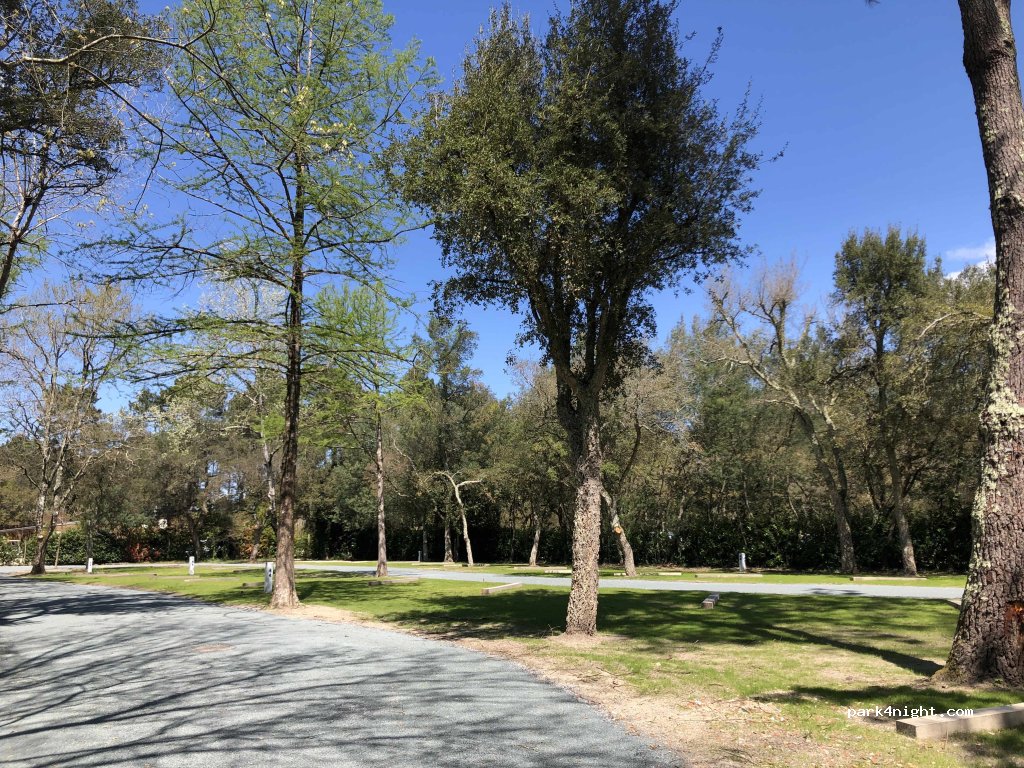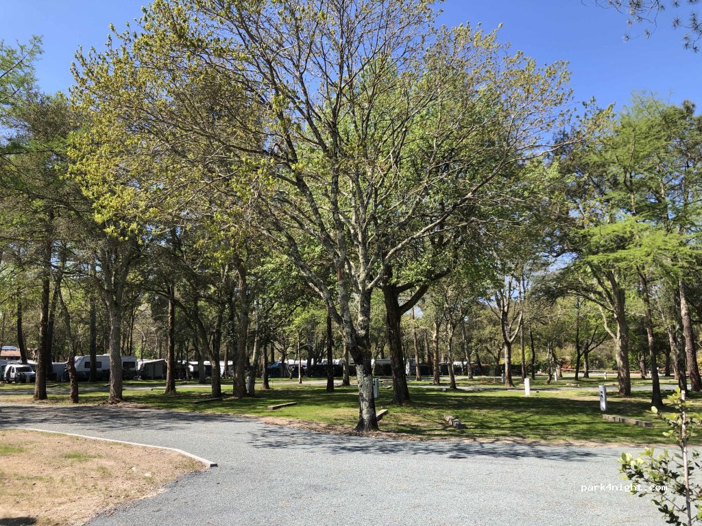 Aire ombragée avec vidanges et électricité, au calme malgré la route principale non loin et la proximité des campings. Les emplacements sont bien délimités avec des barres en bois mais suffisamment larges pour ouvrir le haut vent. A 5 minutes en vélo du centre ville. Au sol herbe et sable. Accès à la piscine couverte et extérieure avec toboggans du camping pour 5 euros.