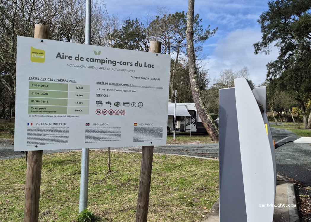 NOVEDAD: Zona de autocaravanas situada en la entrada del Camping Nature L'Airial, en un entorno arbolado y tranquilo frente al lago de Soustons.