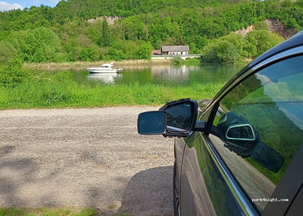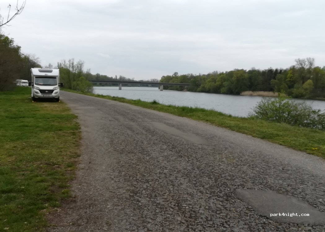 Endroit pouvant accueillir pas mal de camping car. Grand emplacement et calme. Vu directement sur le Rhin, journée calme et nuit très agréable. Poubelle à disposition le long de la route.