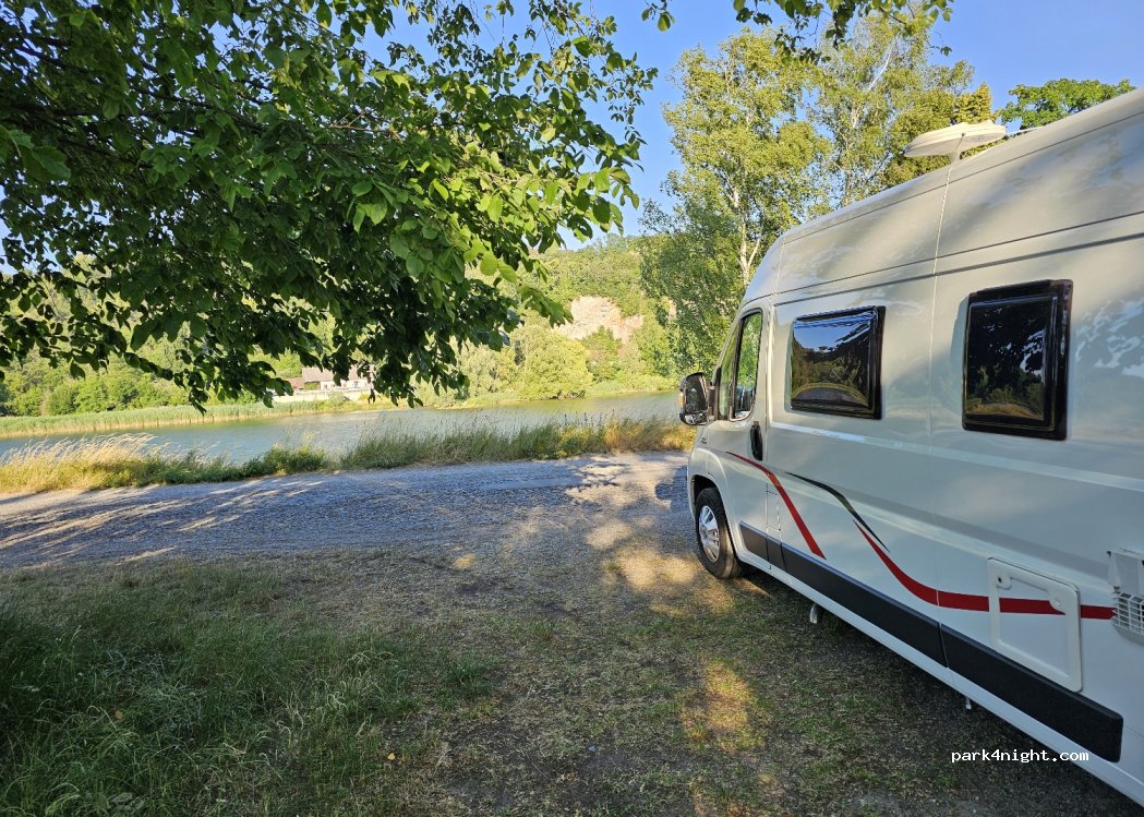 Sehr schöner Platz. Mit direktem Zugang zum Wasser und ausblich auf Berge und eine Burg Ruine. Auf deutscher Seite ist ein Supermarkt in der Nähe. Immer wieder gerne.