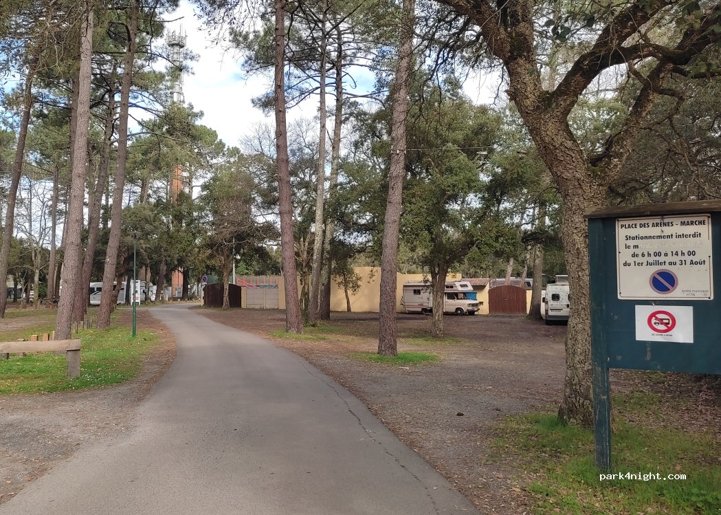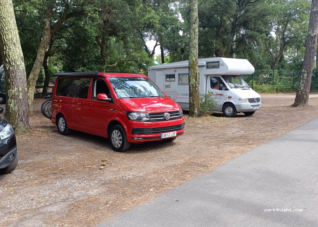 Petit parking boisé juste avant l'entrée de l'aire pour camping-cars de Labenne, devant les arènes.