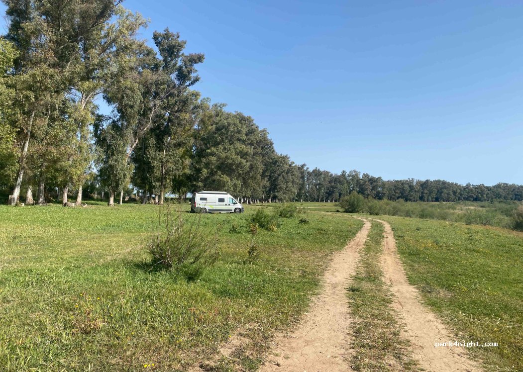 A tranquil semi flat plot on the banks of the Bornos lake accessible for campervan a who don’t mind veering off tarmacked roads and into nature. The lake may be full or, like in March 2023, looking rather empty. Otherwise a great place for kayaking or even swimming but you may have to walk to get to the waters edge if low water levels. Very green, in spring be ready to be ambushed by horses and cows . The view is stunningly baby blue and green .
