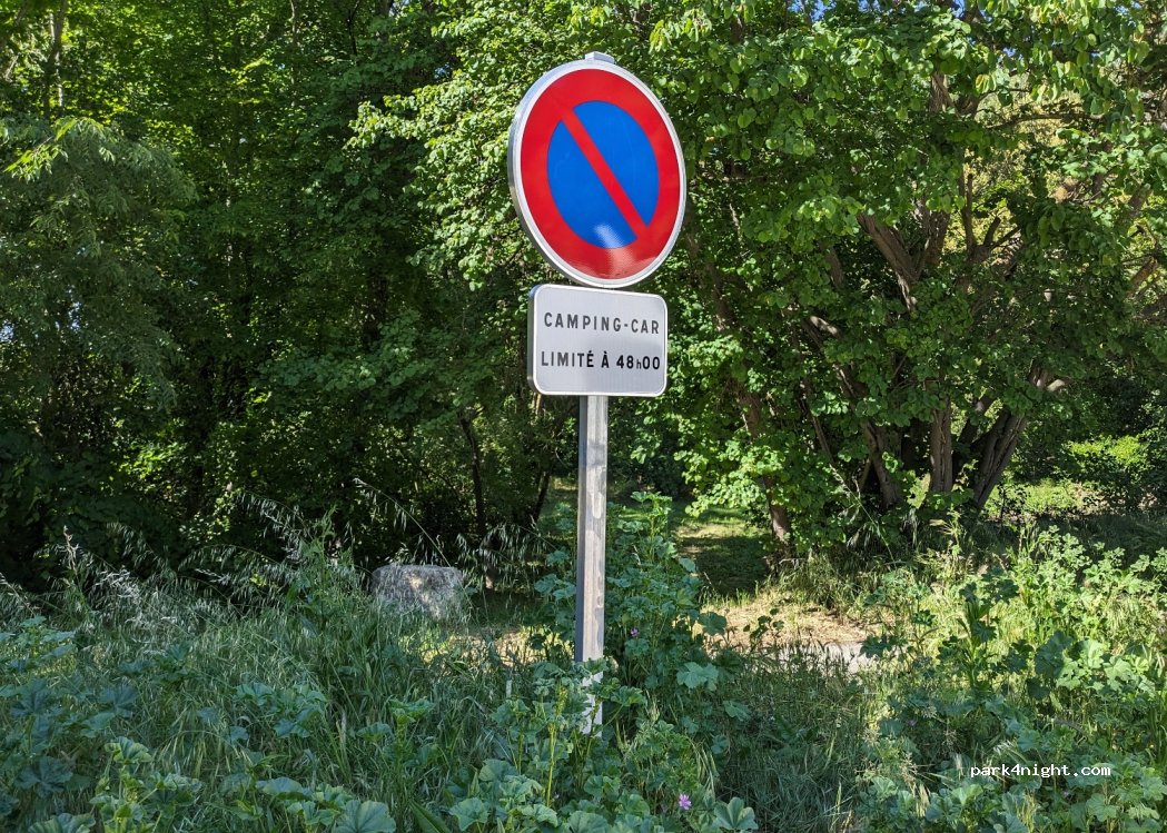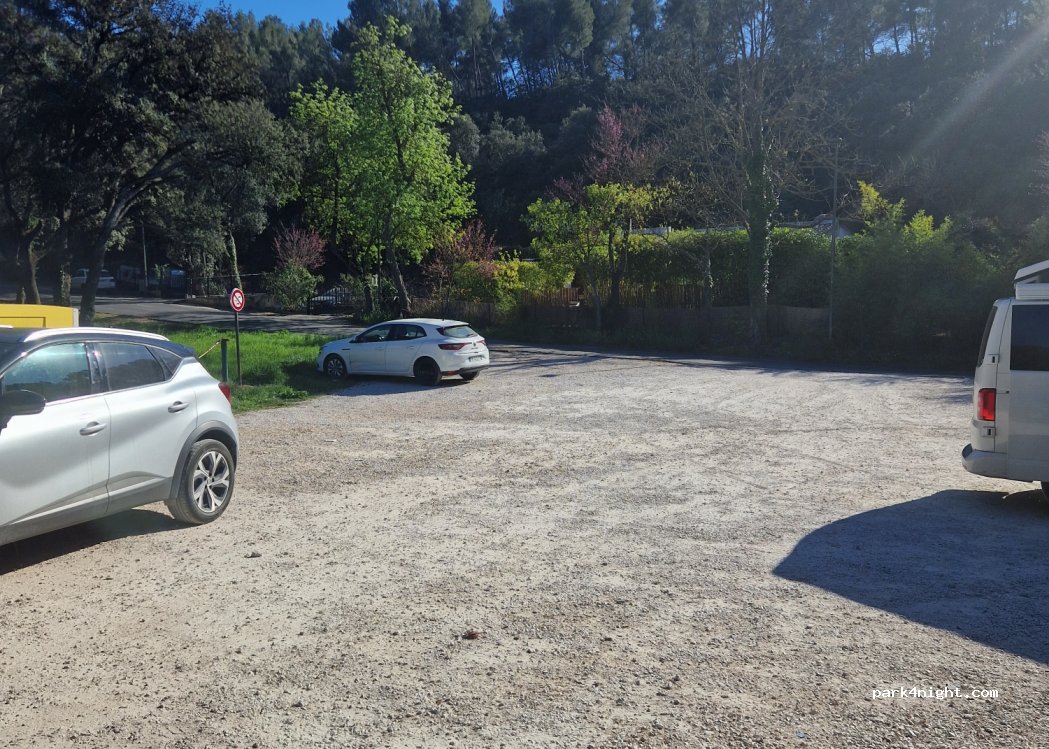 Petit parking graviers,plat et proche d'une route (passage modéré). Coin de verdure à côté avec des tables de pique nique. Stationnement limité à 48 heures pour les camping-cars.