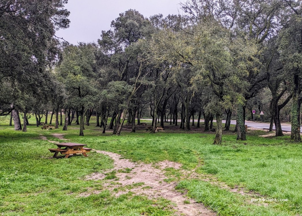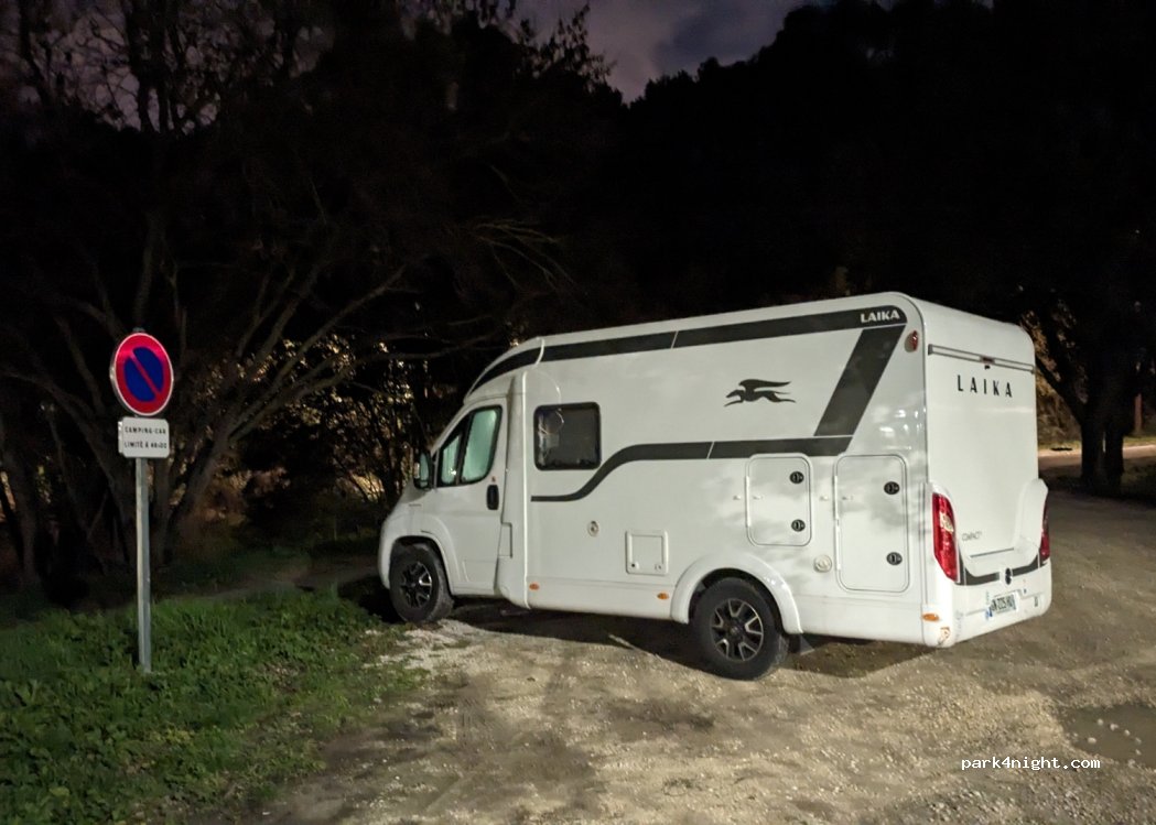 Parking utilisé par la clientèle du restaurant d’à côté donc plein. Totalement éclairé par un lampadaire et proche d’une route passante. Nous ne sommes pas restés.