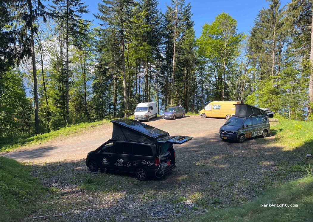 Spot sympa avec accès a un pré pour la vue sur le Leman mais l'endroit lui-même est dans la forêt (pas de vue depuis le Spot). Il y a de la place pour 4-6 vans.