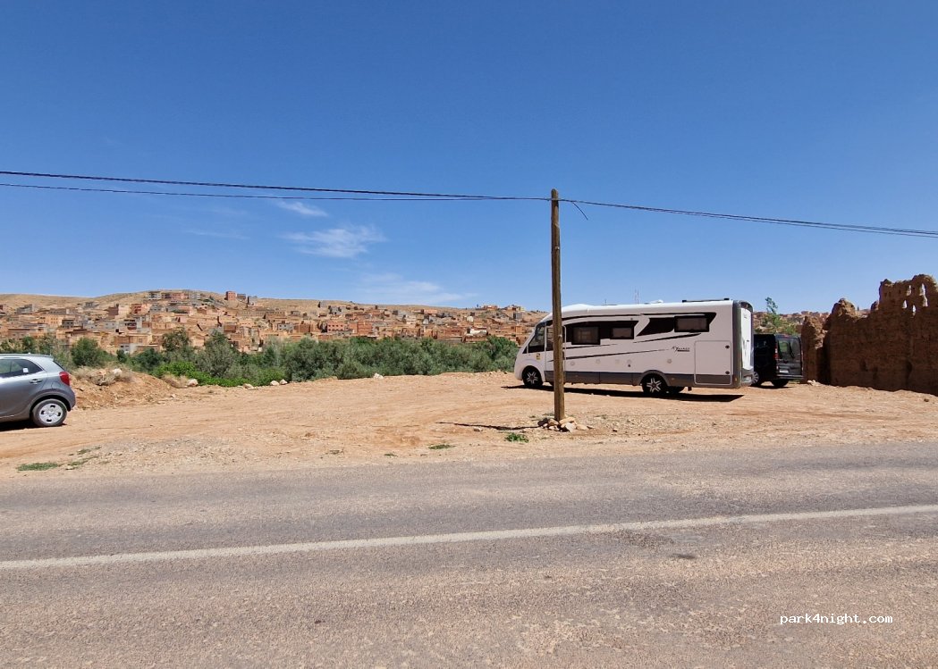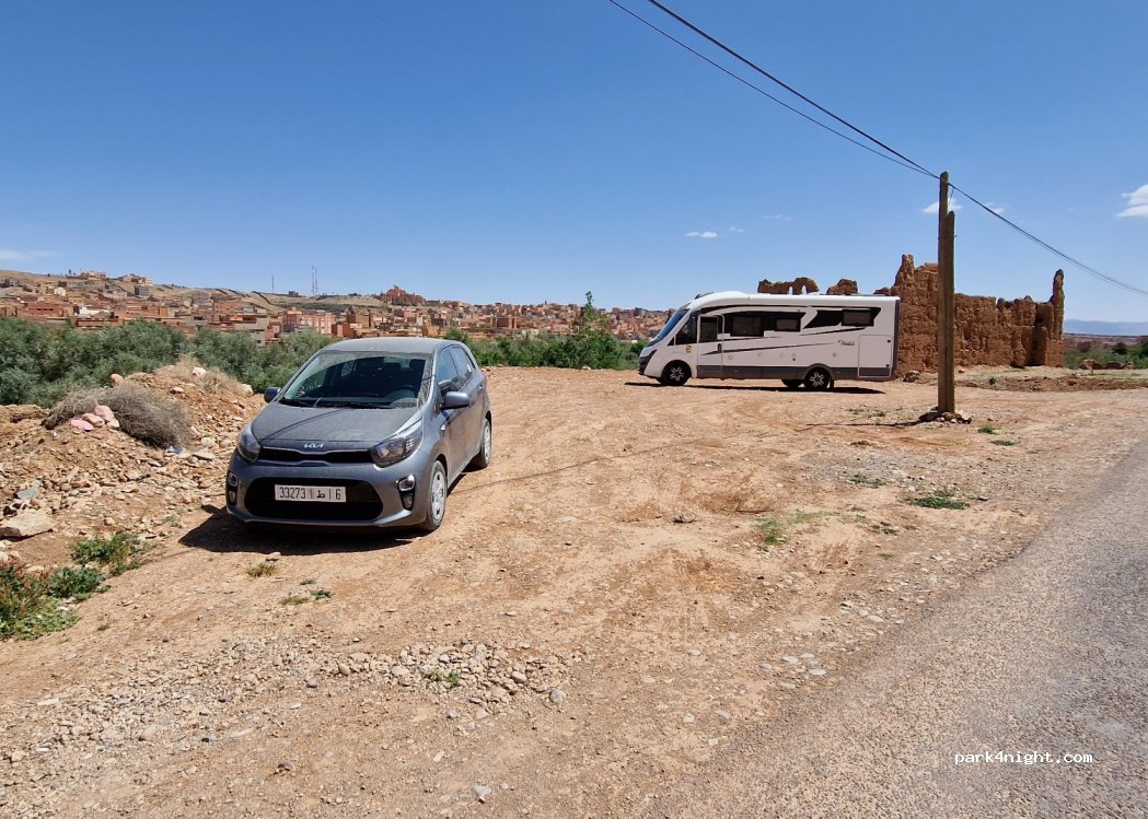 Petit parking en terre, plat, fait de remblaiement juste pour une pause déjeuner. Belle vue sur la ville et sur de la verdure ce qui est plutôt rare dans cette région.