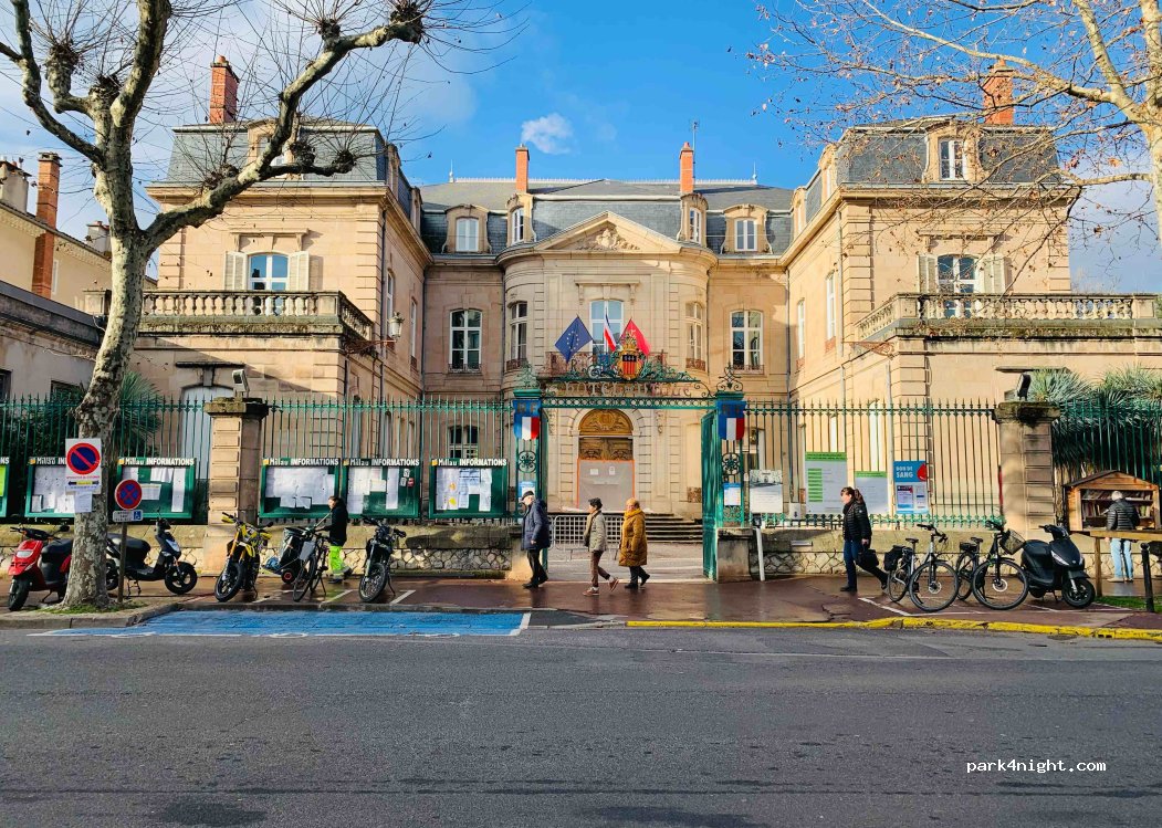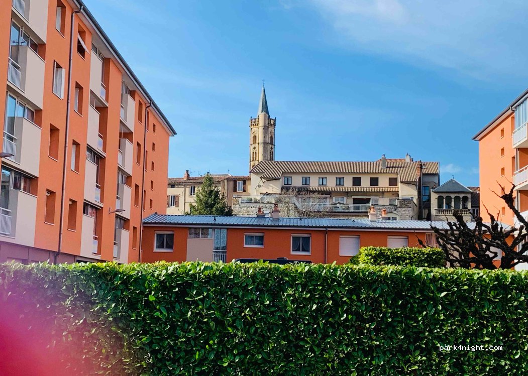 Parking near the city center for motorhomes. Toll parking. The name is Parking du Prieur. Peaceful place.