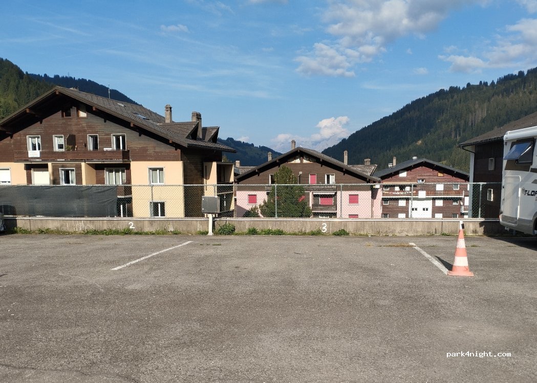Vlakke camperplaats. Je hoort de hoofdweg overdag maar dit is niet storend. Er staan pionnen zodat je je plek overdag bezet kunt houden. Dank aan de gemeente Morgins om deze plek beschikbaar te stellen, een voorbeeld voor andere Zwitserse gemeenten.