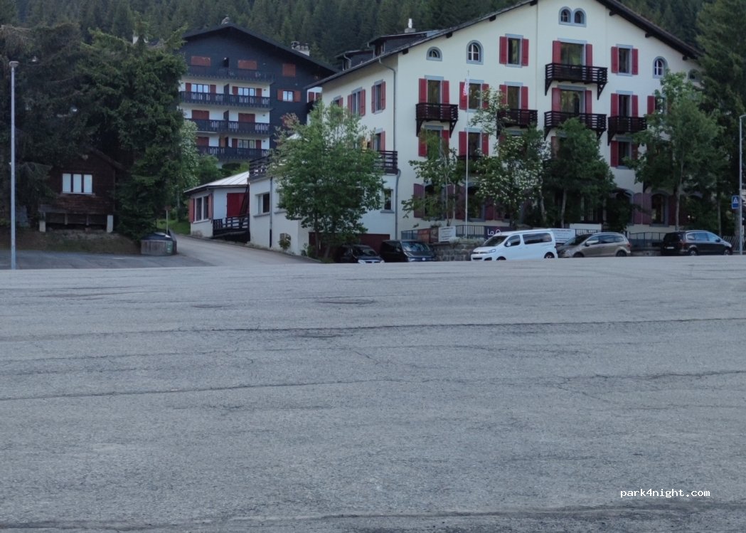 Look for the green sign. There are 7 spots, very wide. Across the street you see the yellow sports centre where you pay the tourist tax and receive the voucher for your windshield. The sports centre has indoor tennis, and an outdoor summer swimming pool. There is beginner ski lift there also.