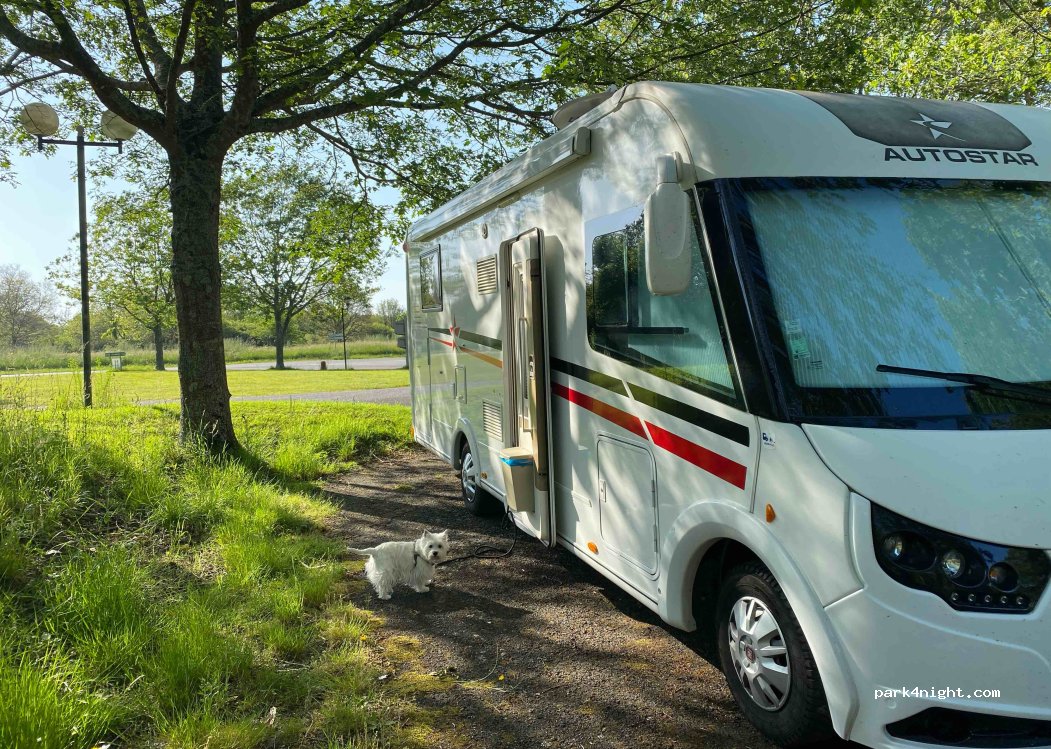 Buen lugar para pasar la noche de camino a Bretaña. Muy tranquilo, suelo nivelado, con sombra. Ningún servicio. No hay iluminación. Otra furgoneta y nosotros. Por la mañana se oye el ruido de la carretera que está cerca.