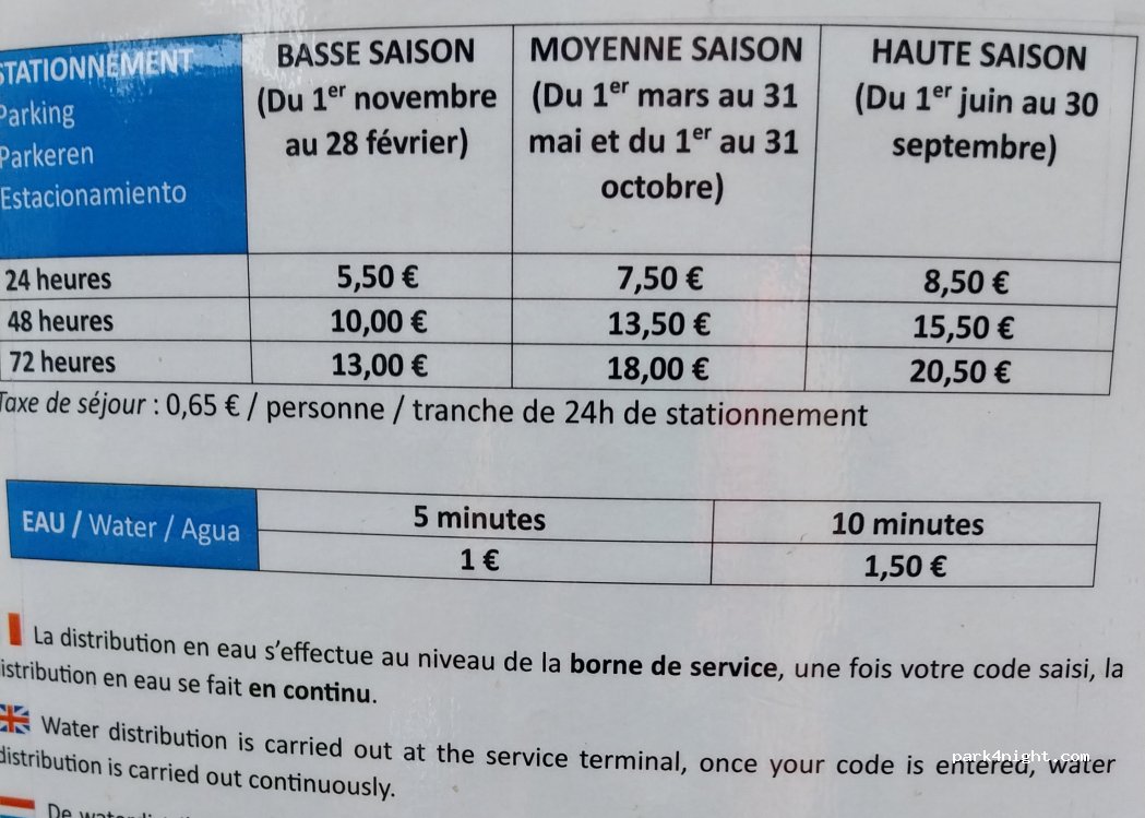 Bonjour ! on a passé une nuit ici, très bien dormi endroit très calme, bruits des papns avant 20h on a payé environ 8euros avec les deux taxes , sans prendre le tarif eau ni électricité