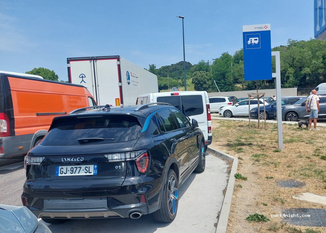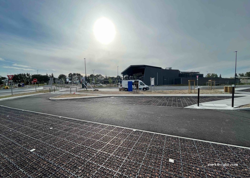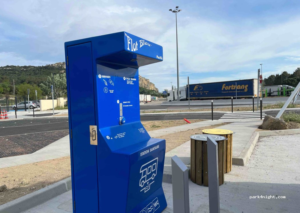 Aire d'autoroute très propre avec commodités (eleclerc, sandwicheries, ....) Services : Toilettes, douches, vidange eaux grises. Nous y avons passé une nuit tranquille, malgré nos apprioris sur la sécurité. Pas de bruit d'autoroute.
