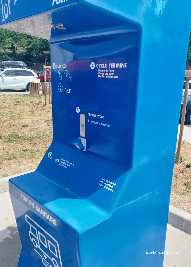 Borne bien signalé en bon état et en fonctionnement. malheureusement c’est une flot bleu avec comme toujours le tuyau d’eau propre dans le compartiment de vidanges des eaux noires - pour l’hygiène vous irez ailleurs faire votre plein d’eau propre