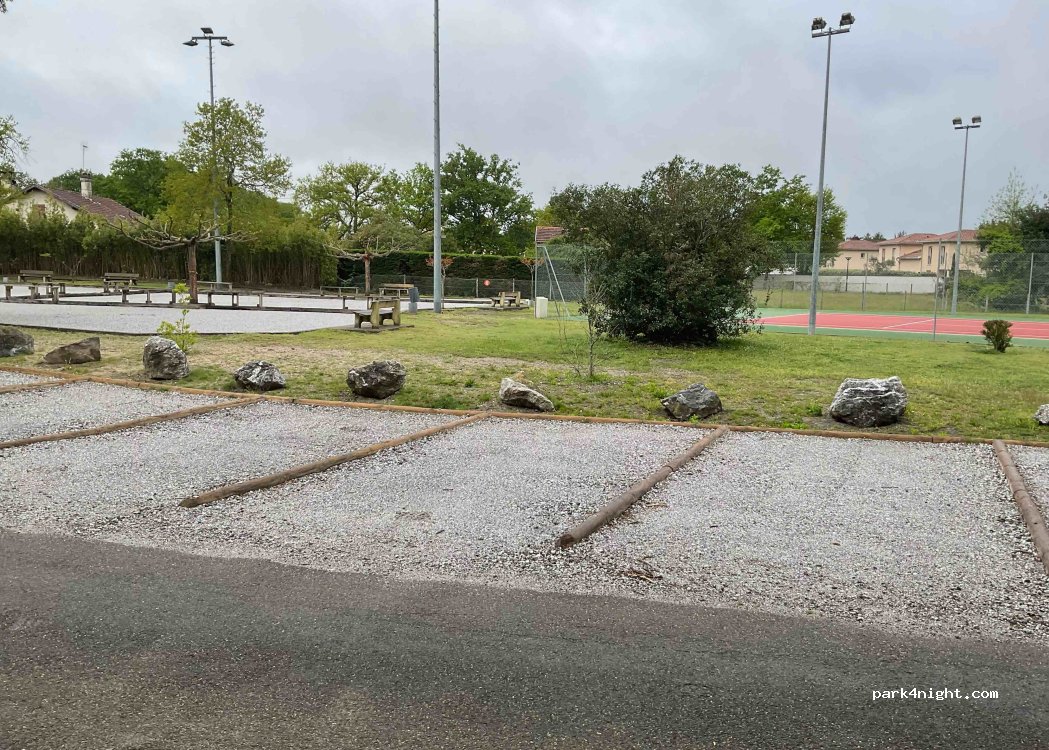 Small quiet car park with about ten spaces next to the tennis club. Church bells from 7 a.m. Parking just before the 2.10m barrier. A picnic table and pétanque courts present. Ideal for vans, not suitable for motorhomes.