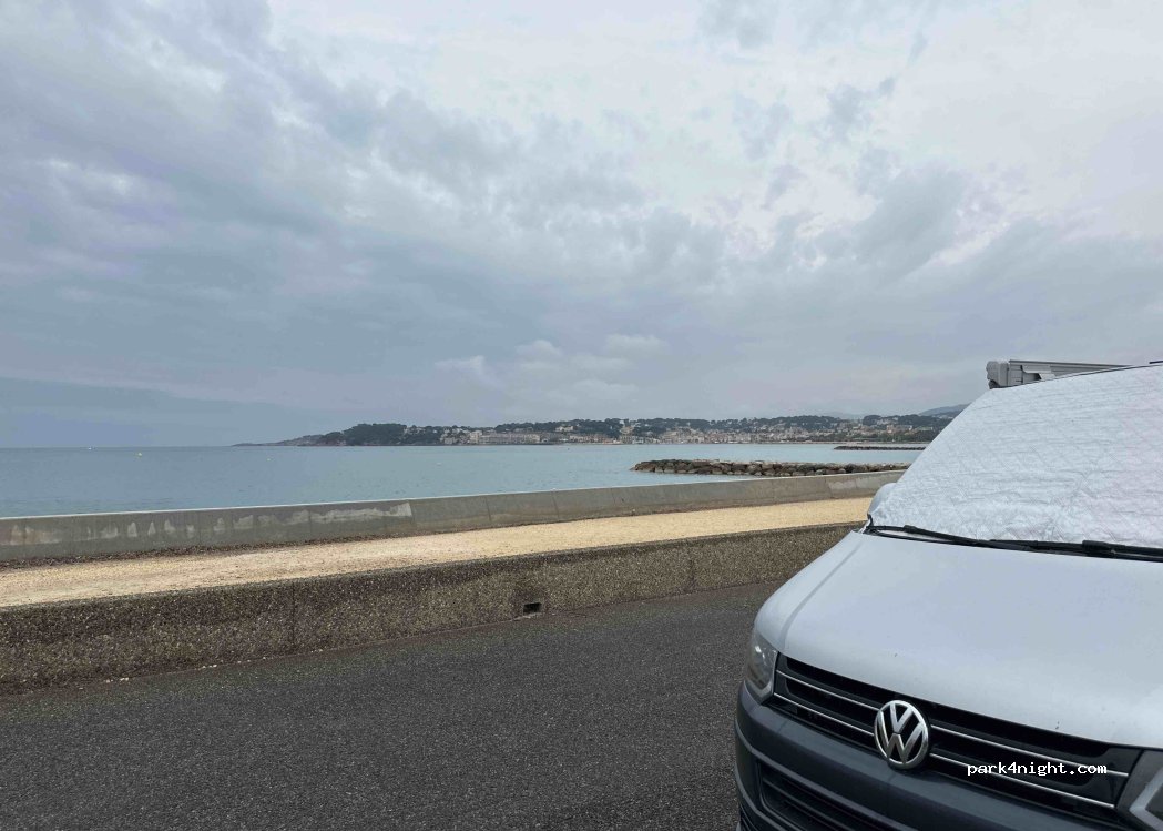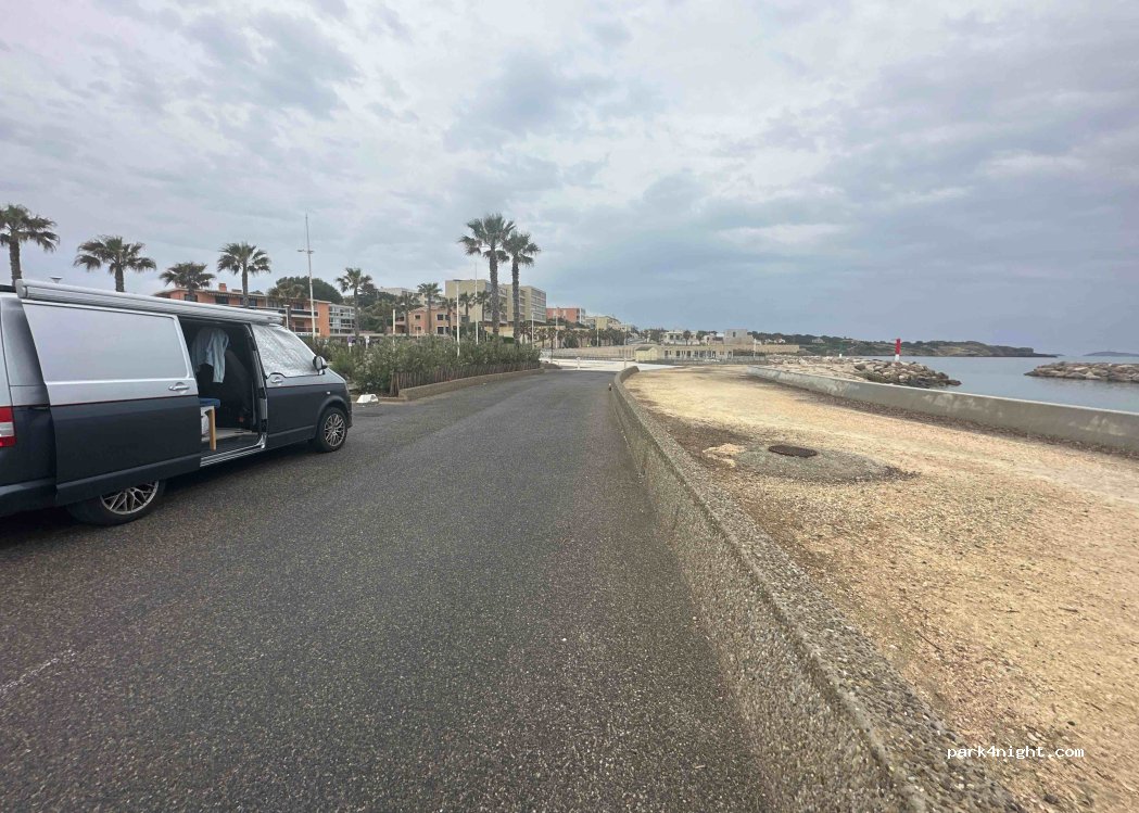 Access limited by 1m90 gate , unlike the other car parks offered this one is free, and slightly away from the road, it nevertheless remains slightly busy and noisy in the evening but we we are in town and the beautiful days are here… beach 50 meters away, port 20 minutes on foot public toilets 5 minutes away but not always open.
