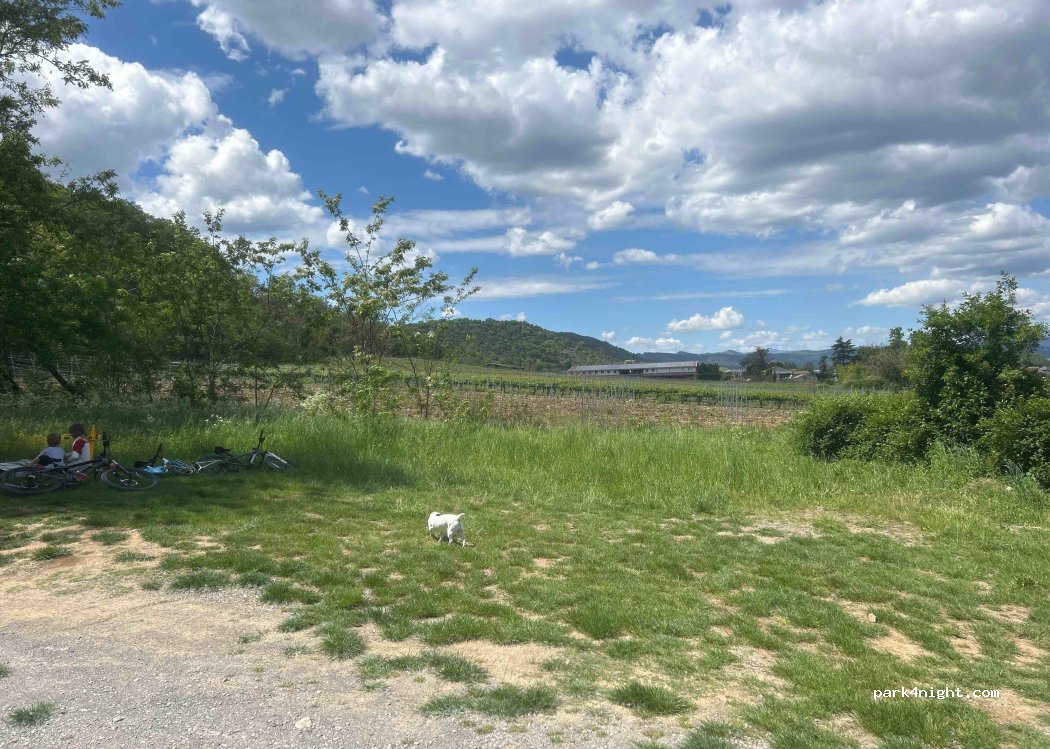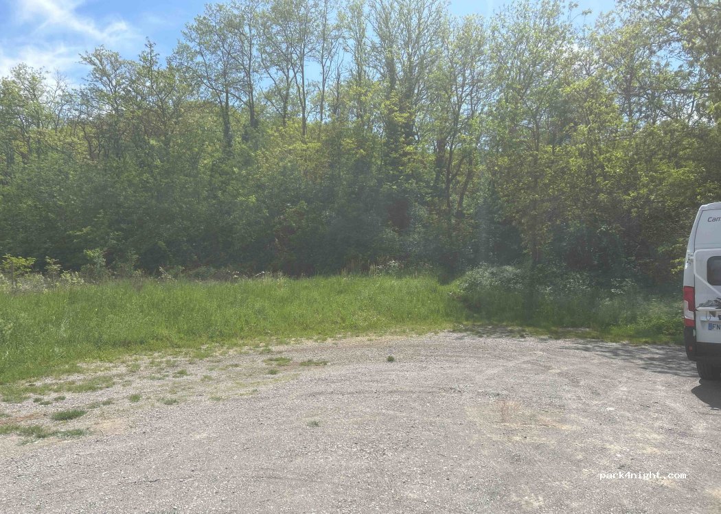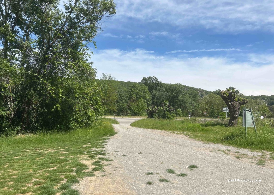 sur la D579, dépasser ce parking, un peu plus loin prendre la 1ère à gauche, passez devant le parking des bus puis le domaine de Lou, ça passe pour les c.cars, un peu plus loin sur la droite avant de reprendre la D579, il y a un emplacement pour 2c.carsou 3 vans, mais juste pour déjeuner et visiter le vieux village de Doüé, pas derestriction de stationnement a ce jour, bonne route.