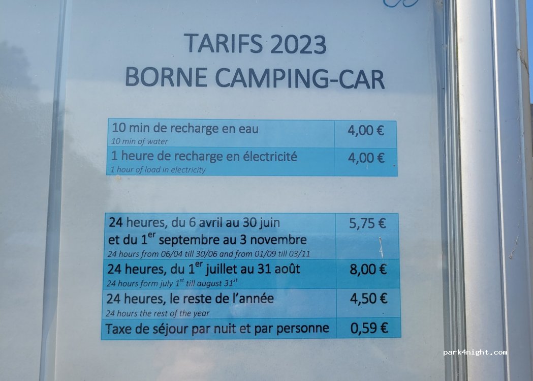 aire camping-cars place des tamaris payante 8 euros par 24h et services payants 4 euros. en ce moment la barrière est en panne. à 100 mètres de la plage. camping municipal tout proche.