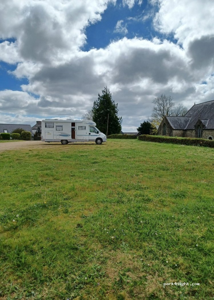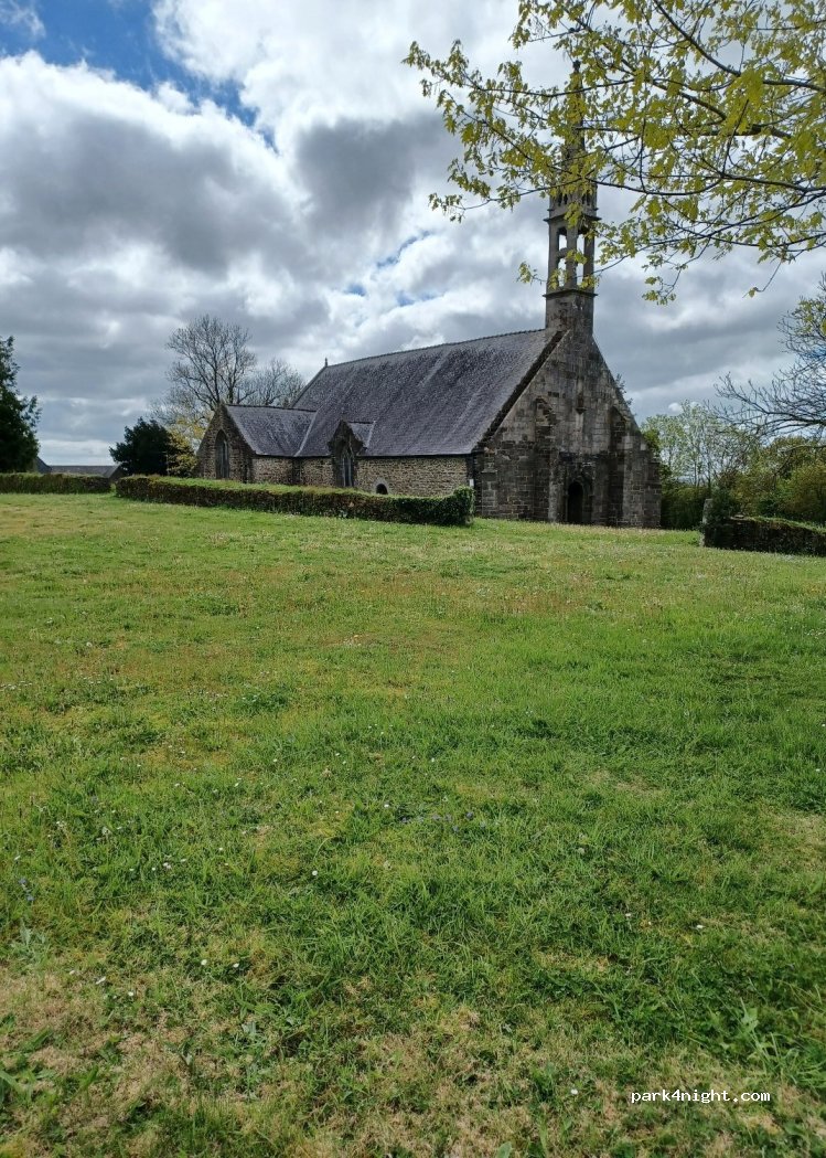 Lannelec Chapel, a quiet location, with parking spaces on grassy gravel and dry-season grass. No trash cans or services. Access is easy via a small path suitable for all vehicles, but with no crossings for about 100 meters.