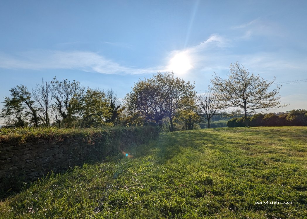 Parking jour et nuit, aucune interdiction. Endroit calme où se poser, bruit de la route départementale pas trop gênant.
