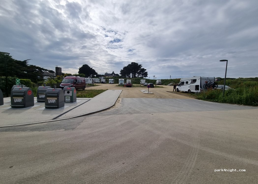 Àrea de serveis per aigues negres i aigues grises, no te aigua neta. Hem fet els serveis però no hi ha aigua pel poty i es incòmode de fer ja que tota l’estona cau la tapa. Gran explanada de terra. Prohibit aparcar de 22h-7h. Ideal per visitar Pointe du Grouin i dinar. No hi ha ombra. Hi ha contenidors de reciclatge.