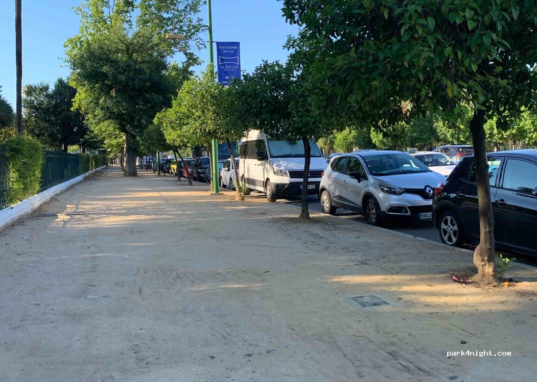 Free street parking, we spent 2 nights, the only traffic noise in the morning. You can leave the car all day. Drinking water 100 meters inside the park. 600 meters from Plaza España, very beautiful and 1,200 meters from the historic center.