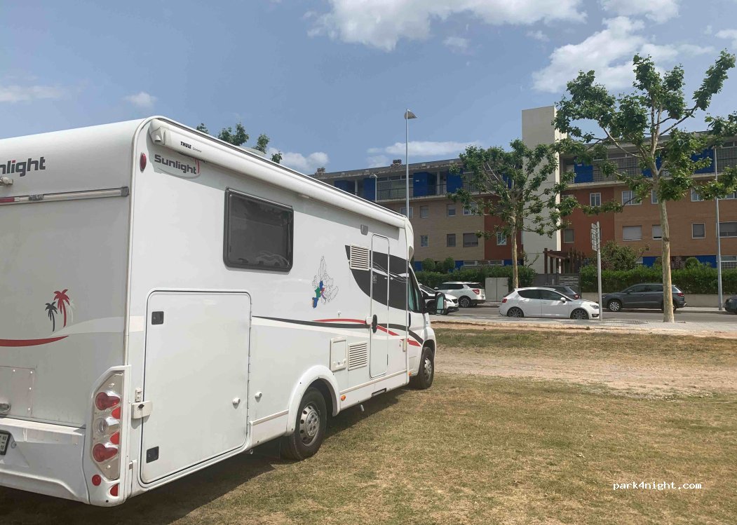 Public dirt and grass parking, fairly well leveled. No length limit. Located in a small, quiet town with all services and very close to Port Aventura, Salou, etc. for cycling