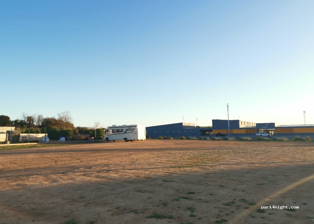Parking público de tierra y hierba, bastante bien nivelado. Sin limite de longitud. Situado en pequeña ciudad, tranquila con todos los servicios y muy cerca para ir en bicicleta del Port Aventura, Salou, etc