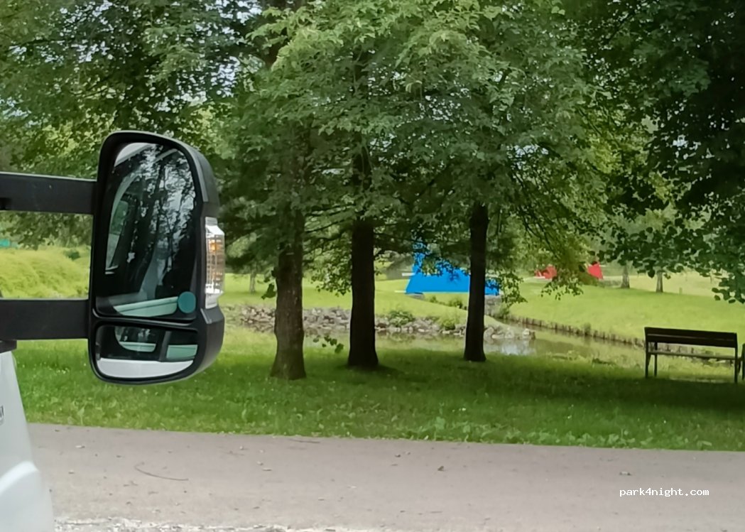 chouette endroit face au grand parc, rempli de points d'eau, de points d'herbe, jeux d'enfants, bancs, ponts... mais pas de service sur place (eau et électricité sur la place de l'autre côté du lac)