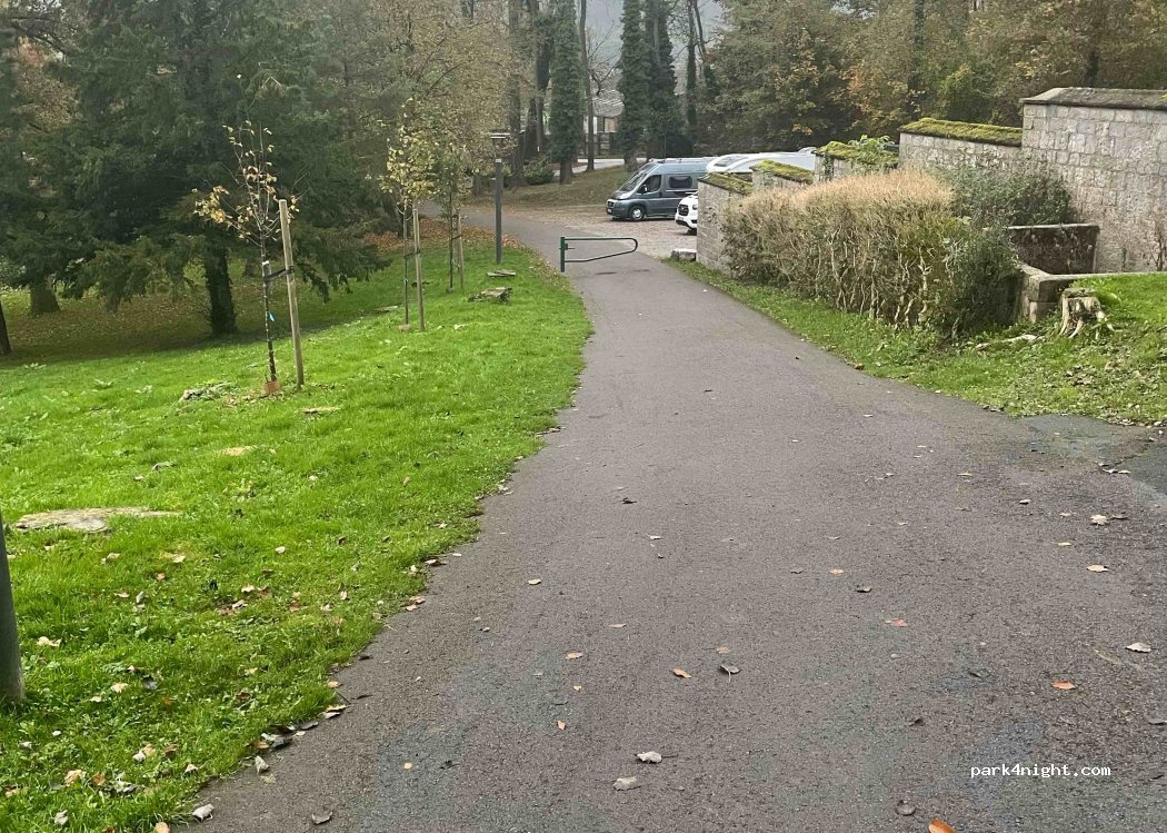 zeer rustige parking zonder nutsvoorziening gelegen achter het park. Kostprijs is 5€. Wel te betalen op de parking in centrum. 300 m wandelen. Betaalterminal was buiten werking. Dus nu gratis. Ook openbaar toilet aan kasteel. Zeer goed voor enkele overnachtingen