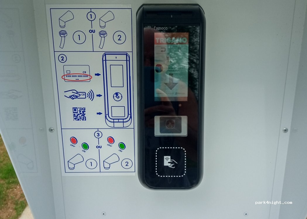 Endroit très calme même si à côté du stade. Merci aux habitants de cette commune pour son bel accueil. Seul bémol sans contact ne fonctionne pas pour le moment mais si le cadran s'allume on peut rentrer les codes : n* carte, code carte, pictogramme, code sms et code sécurité , un peu galère mais l'eau se mérite même quand il pleut. Site bien aménagé arboré, tables, herbe, jolis jeux de boules